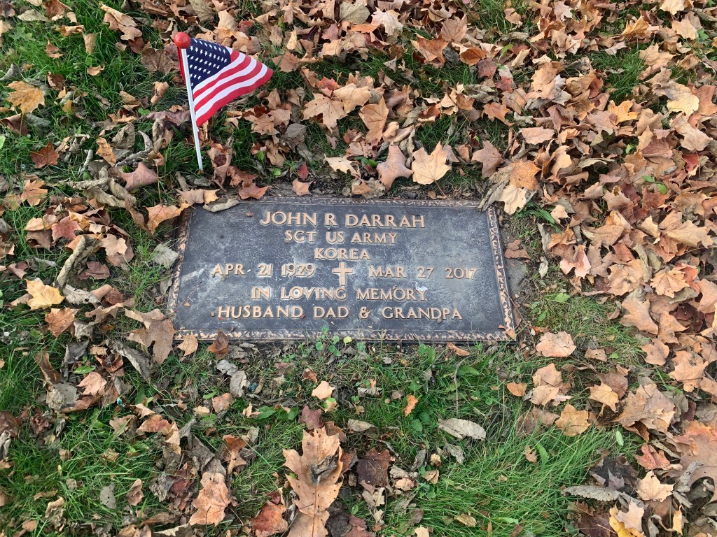 With you here now, we decided to take you to Lansing with us on this Veterans Day to visit the Darrah family plot. It was a beautiful fall day, perhaps one of the few we have remaining this year. Your Grandma placed flowers on Grandma Ann’s newly laid headstone, and planted an American flag next to Grandpa Jack’s. We prayed. We expressed how much we miss them, but also the happiness of a sort we can feel in sensing that they are now together in peace.